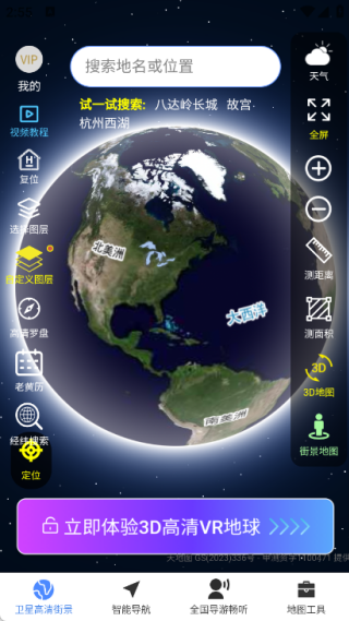 1、进入首页,即可搜索地名或位置,体验3D高清VR地球,还能测距、测面积,功能强大。
