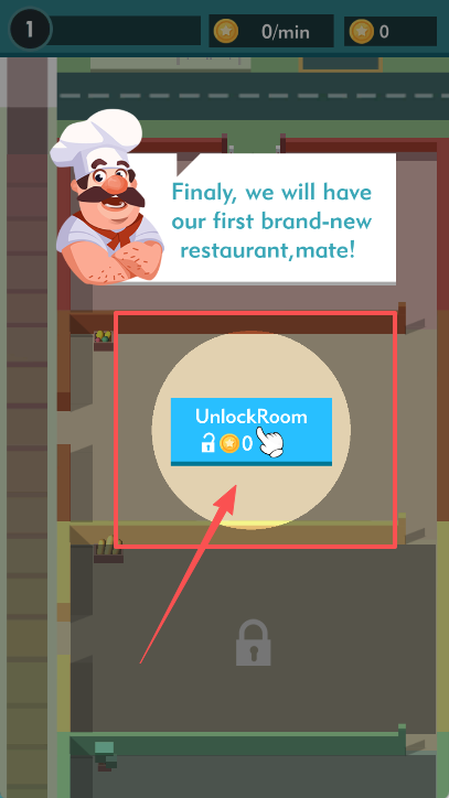 1、看游戏主界面,点红色框内蓝色UnlockRoom按钮,用金币解锁新餐厅房间,手指点击操作。
