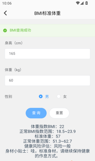 4、然后大家输入身高、体重、性别后,点击“查询”按钮就可以获取详情计算数据了。