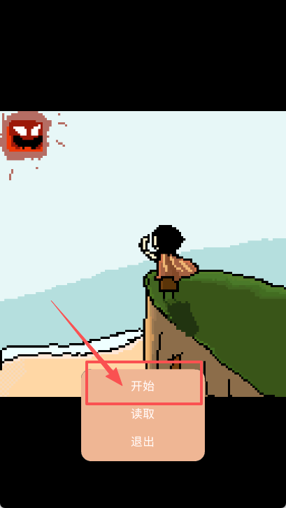 1、看到像素游戏界面底部偏右浅棕色菜单框,直接点击这个开始按钮就能开启游戏,旁边还有读取和退出选项。