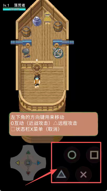 2、下方提示框告知左下角方向键移动,近战攻击、远程攻击等,按提示操作虚拟手柄上对应的圆形、三角形等按键进行游戏。