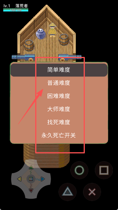 3、看到游戏难度选择界面,中间窗口有六种难度选项,当前简单难度被红框标注且有红色箭头指向,点击它来选择此难度开始游戏。