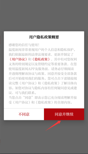 1、首次启动温州温度APP时,系统会显示用户协议与隐私条款,仔细阅读后点击同意进入平台。
