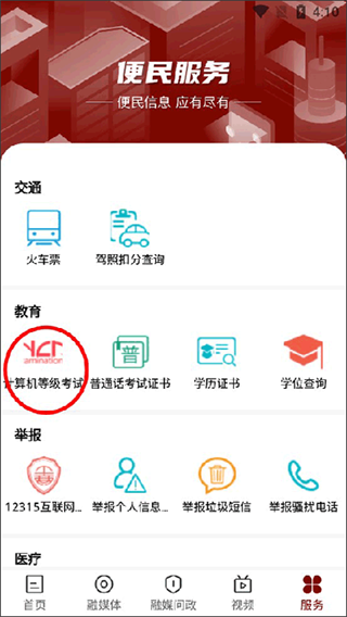 3、于教育服务分类中定位计算机等级考试选项,点击进入查询页面。