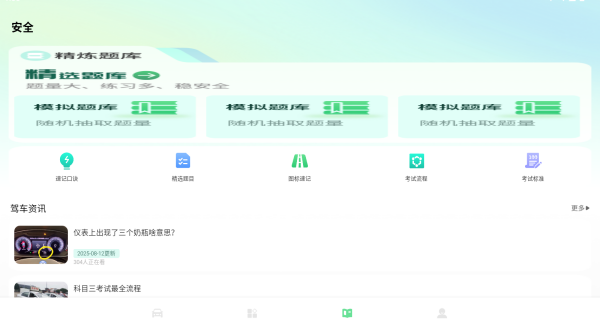 4、打开安全板块,软件提供了很多精选的题库,只要你全部答会了就可以考试了。