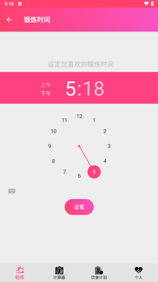 1、进入软件首页锻炼板块,用户可以设定每日锻炼时间,让软件及时提醒锻炼。