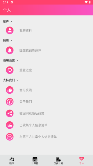 4、个人板块,用户可以设置个人资料,进行针对性的锻炼。