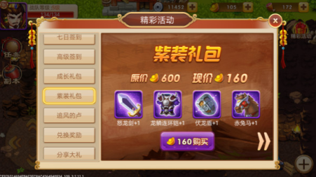 3. 大家攒的元宝可以将精彩活动里面的160元宝的紫色套装都买了,这个相对来说很划算,前期成长较快,而且160元宝都可以买3件紫装,而城镇商人出售的紫装最低都是320一件的。