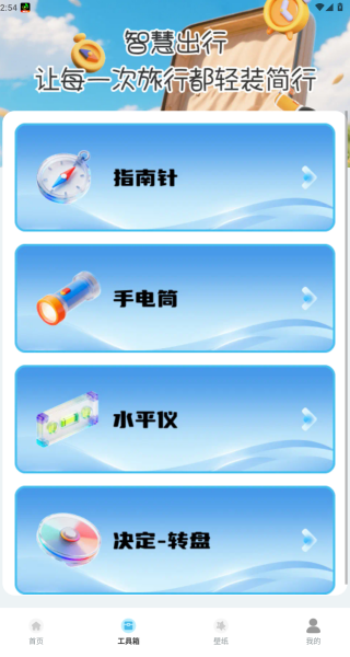 3、切换到工具箱板块,这里有指南针、手电筒、水平仪和转盘等工具。