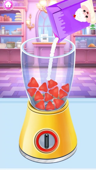 4、点击榨汁机,将草莓放入榨汁机里,加入牛奶,点击启动键,制作香甜的草莓酱。