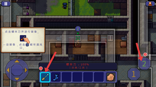 4、点击道具栏中的螺丝刀完成装备,随后再次点击屏幕右侧2按钮,使用工具破坏通风口以推进逃脱进程。