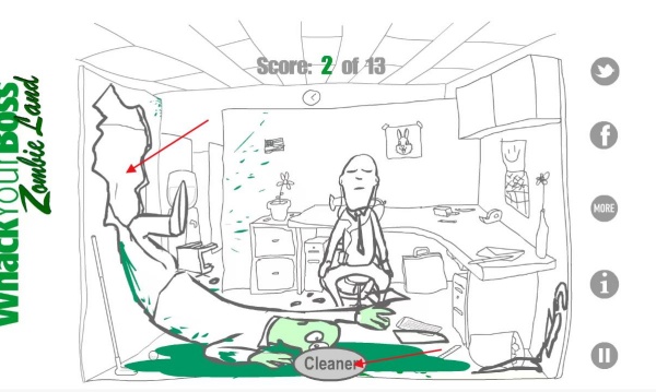 痛扁僵尸老板是一款充满黑色幽默的点击解谜游戏,在你的僵尸老板即使死后依然在压榨员工,面对这个不知疲倦的监工,你需要发挥创意,利用办公室里的各种物品来“教育”他。从普通的文件夹到神奇的魔法道具,共有13种独特的教训方式隐藏在场景中。
