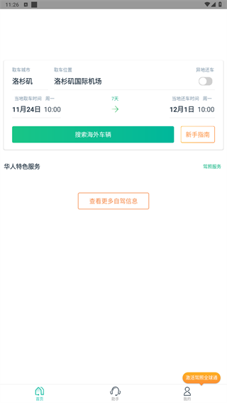 3、进入软件首页,输入取还车位置和用车时间可以进行搜索查询。