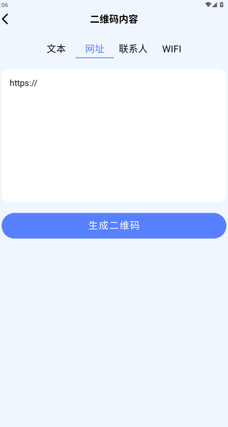 1、进入软件首页,你可以自制二维码,还可以扫码生成文本、网址和联系人。