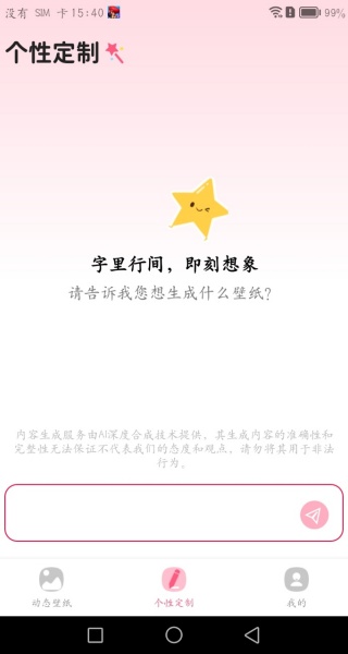 3、打开个性定制,输入你想制作壁纸的类型和详细描述,一键就能生成。