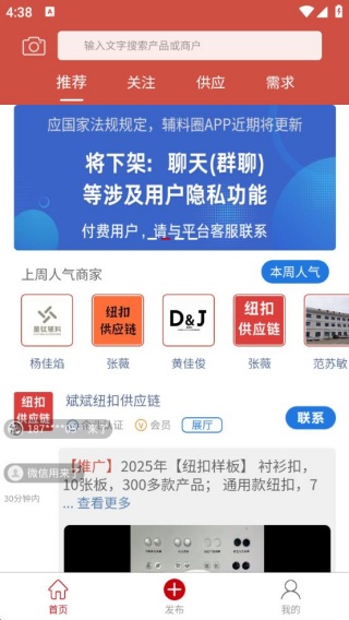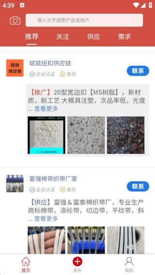 辅料圈app是一款专为鞋服辅料的从业人员打造的产业链平台,海量的辅料品类提供给用户,涵盖了纽扣、拉链、唛标、织带、花边、鞋材等等,可选择感兴趣的类型进行查看,能够轻松了解到辅料产品的详细信息,并根据自身的实际需求,快速与对应的商家进行沟通交流,可以共同商讨货物的供应方式,让用户采购原料变得更加的方便;与此同时,每个用户都能够在此发布供需信息,简单的编辑文字就可以进行发布,展现在众多的同行面前,有意向的商家会及时的联系用户,能够帮助用户快速解决供应和需求问题,非常的实用。