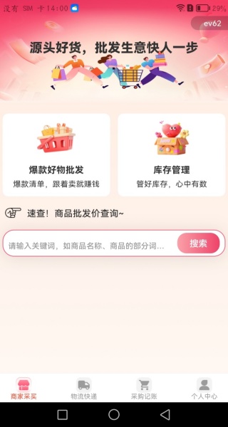 1、进入软件首页,你可以看到这里有很多爆款好物批发,输入关键词,快速的搜索。
