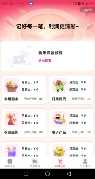 3、打开采购记账,暂时还没有设置预算,可以点击设置,清晰为你展现出支出和收入。