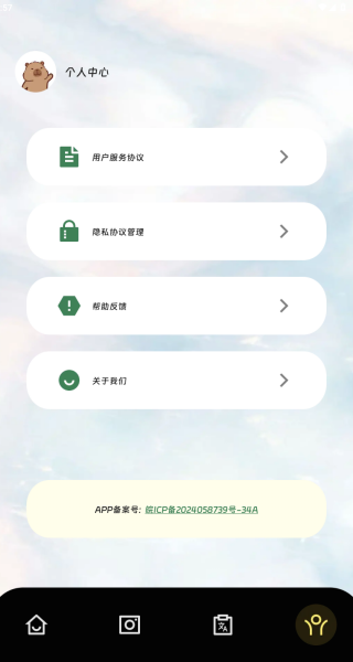 4、点击个人中心,这里有用户服务协议,还有隐私协议管理,你可以反馈意见。