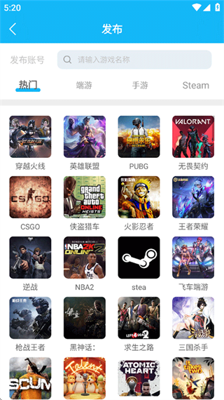 4、系统会将热门的游戏进行在线推荐,方便用户选择推荐的游戏账号进行使用;