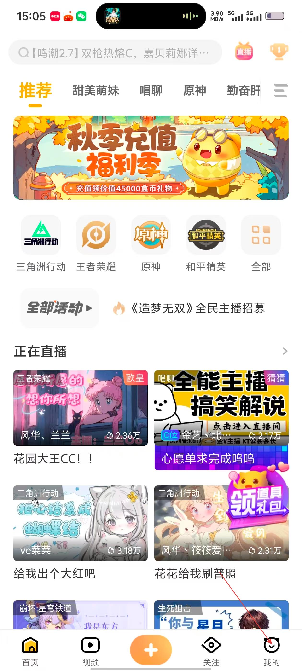1、首页有【秋季充值福利季】活动,还有《三角洲行动》《王者荣耀》等游戏入口,以及正在直播的内容,可按需选择。