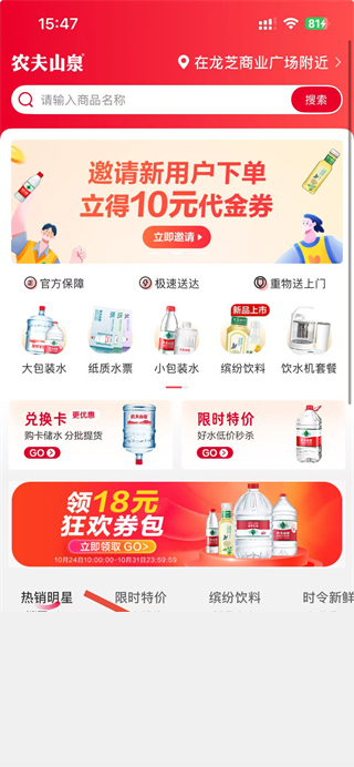 送水到府里头提供了农夫山泉水产品的订购,用户下单后即可享受送水到家,送水到府定期会做相关的活动,例如买赠活动以及送券活动,优惠券直接在送水到府内使用,可以当现金抵扣。