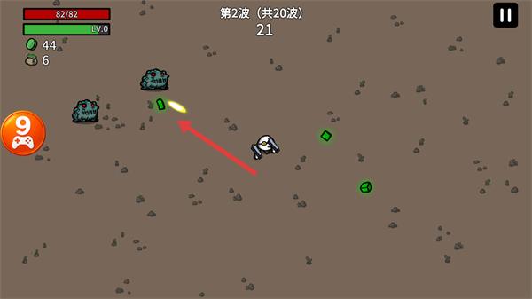 1、在【第2波-(共20波)】战斗中,操控角色移动并发射子弹攻击敌人,同时拾取场景中的绿色道具,积累资源。