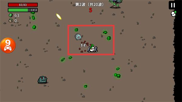 3、角色攻击敌人触发【12】伤害,同时拾取周围绿色道具,资源提升至63。