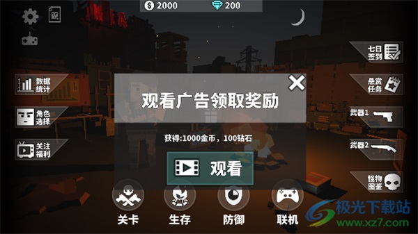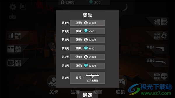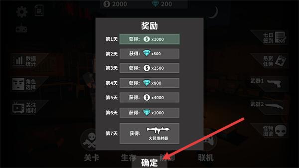 1、在【奖励】界面查看每日福利,第7天可获得【火箭发射器】,确认后点击【确定】按钮关闭界面,继续游戏。