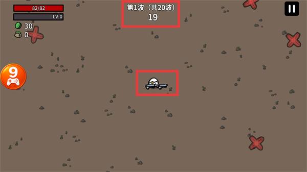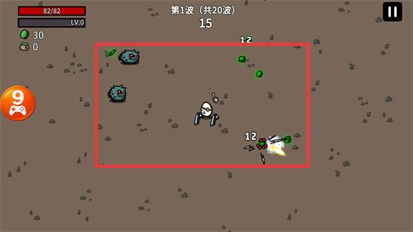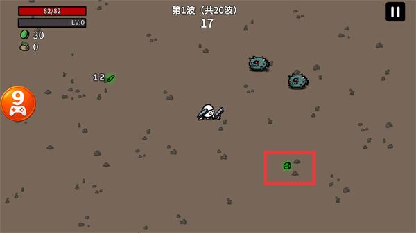 4、在【第1波-(共20波)】战斗中,持续攻击多只敌人,触发【12】伤害并拾取掉落道具,推进波数进度。