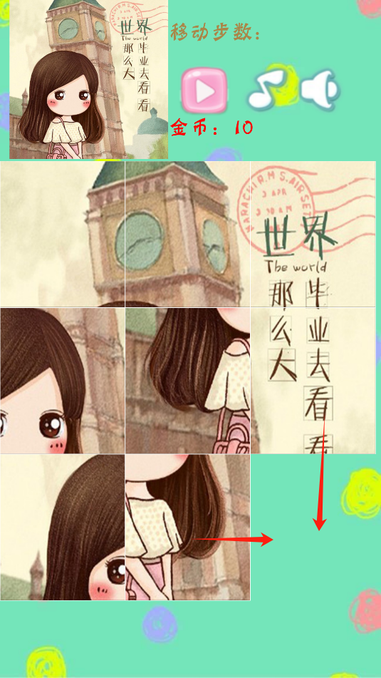 3、左上角有一个完整的样板图,把下方的8个小图,拼成一个完整的图,点击图片,图片会往空缺处移动。