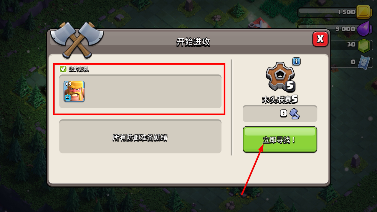 2、进入【开始进攻】界面后,确认您的部队配置,点击【立即寻找!】按钮匹配对手,推进战斗流程。