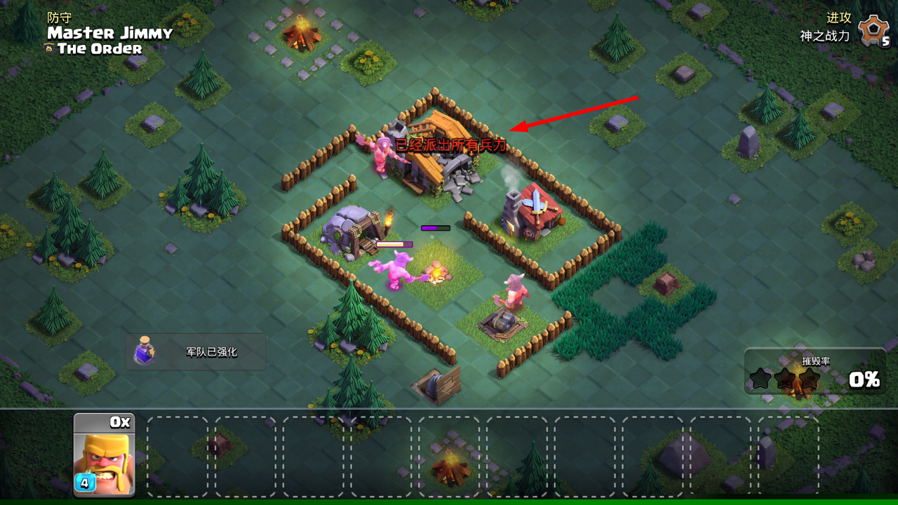 3、战斗开始后,点击下方的【3x-野蛮人】兵力卡片,可派出对应部队,强化进攻能力提升摧毁效率。