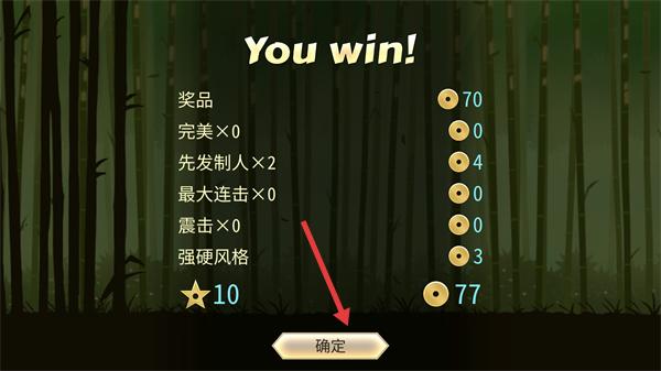 4、界面显示【You-win!】时,查看获得的【先发制人×2】等奖励,点击【确定】按钮结算本轮对战。