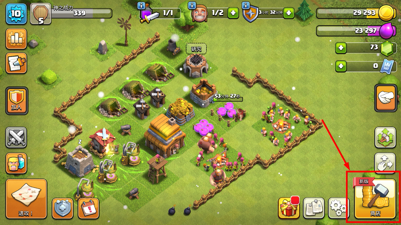 1、点击界面右侧的【商店】,可进入资源与道具兑换的界面,优先兑换加速类道具提升发展效率。