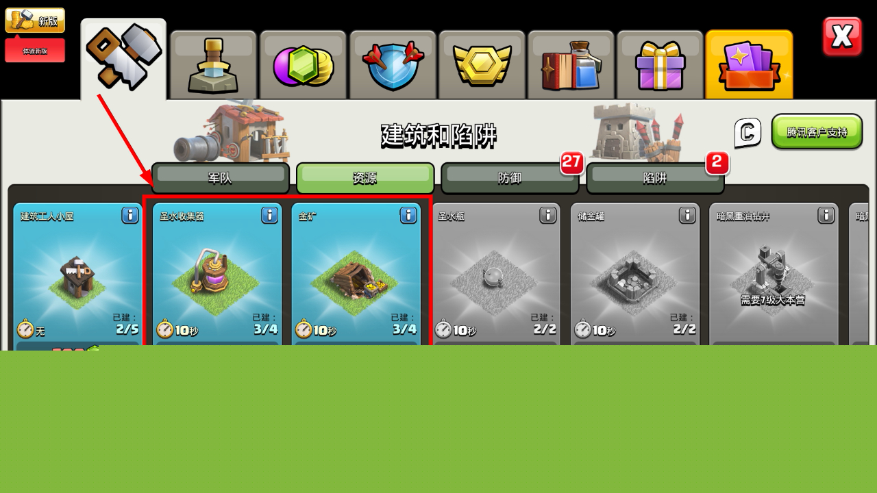 2、在【建筑和陷阱】界面的【资源】分类下,升级【圣水收集器】和【金矿】以稳定资源产出。