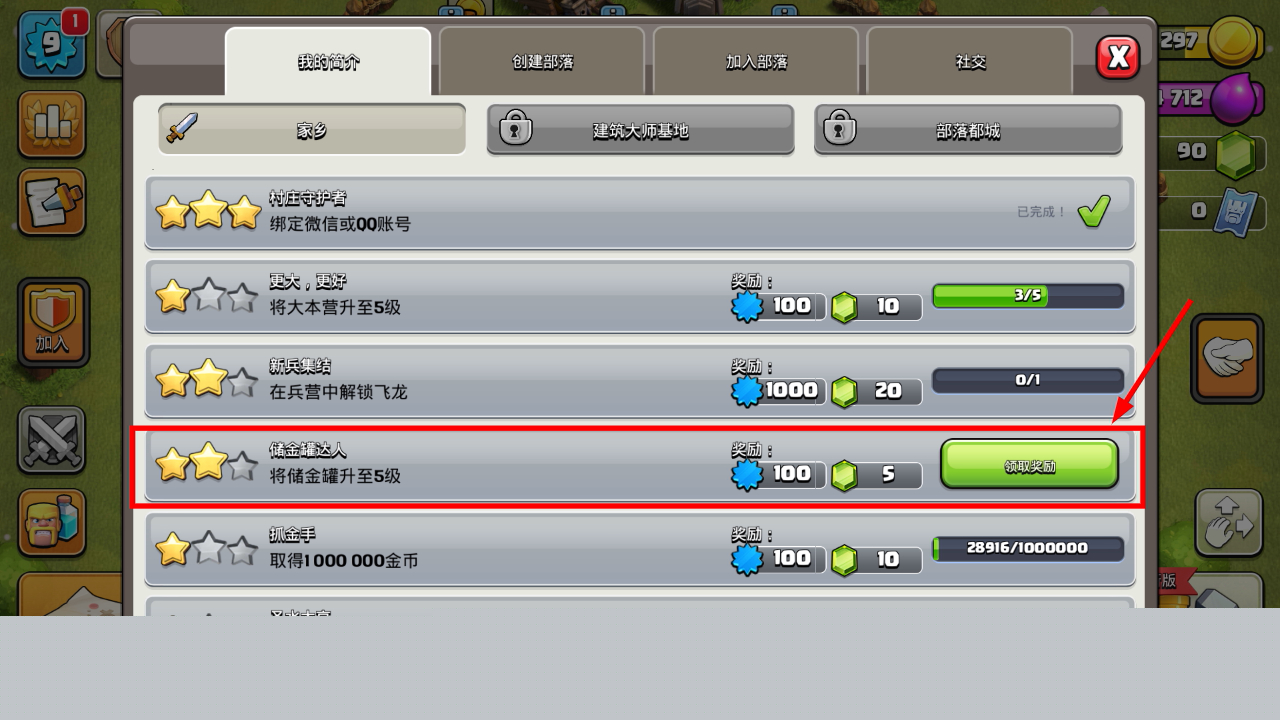 1、完成【储金罐达人】任务后,点击【领取奖励】按钮,可获得【100】金币与【5】宝石,推进游戏进度。