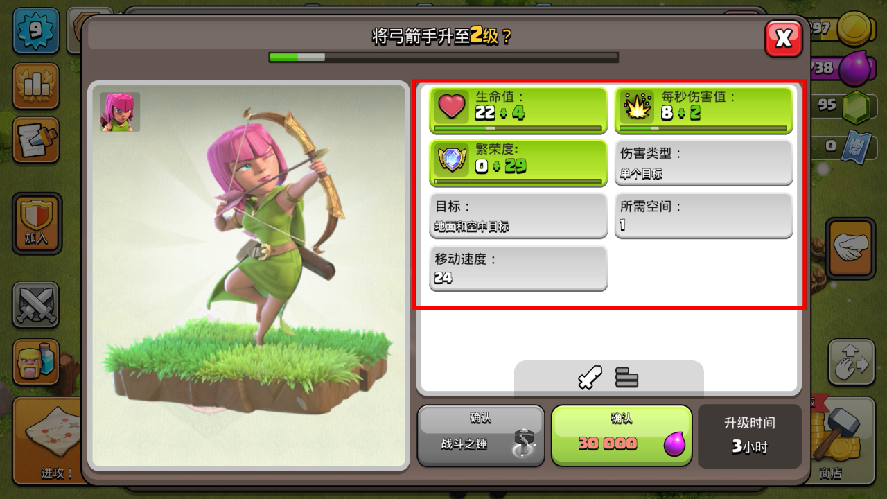 3、升级对象选择界面中,可选择【弓箭手】升级,消耗【30000】资源以提升其战斗属性。
