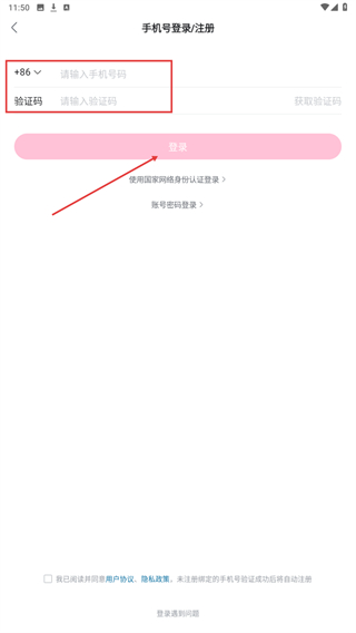 3、在手机号码登录页面,输入手机号码、验证码,再点击登录即可。