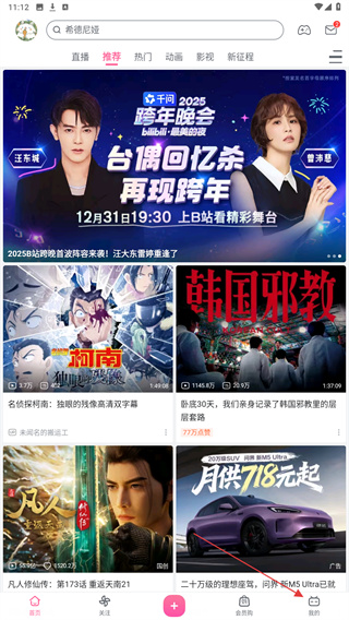 1、启动哔哩哔哩App,点击首页底部导航栏的我的按钮。