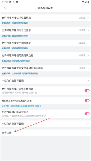 4、在隐私权限设置页面中,找到并点击账号注销选项。