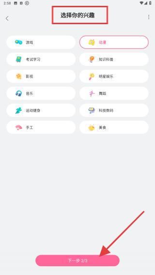 2、在选择你的兴趣页面,点击感兴趣的标签如动漫、游戏等,选好后点击底部下一步2/3按钮。