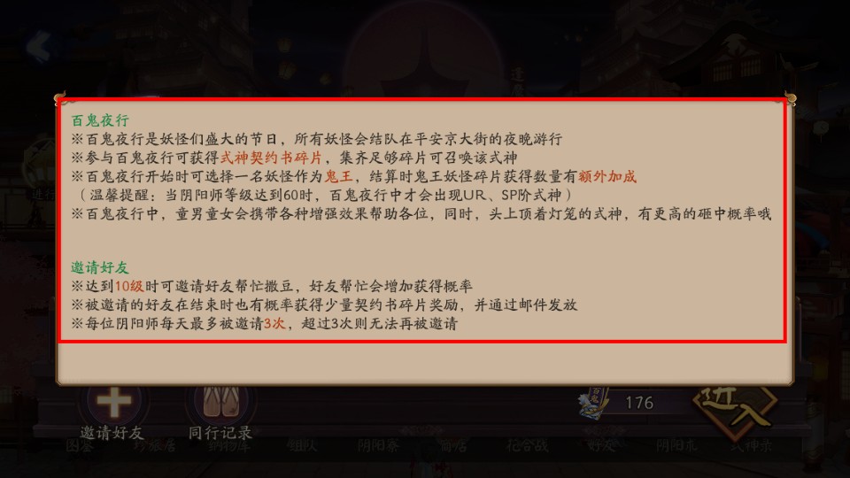 2、参与【百鬼夜行】,选妖怪为鬼王,收集碎片换式神,邀请好友可增加奖励获取机会。