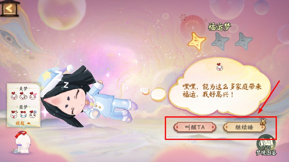 1、在福运梦场景中,角色表达喜悦时,选择【叫醒TA】或【继续睡】可触发不同事件,推进梦境进程获取奖励。