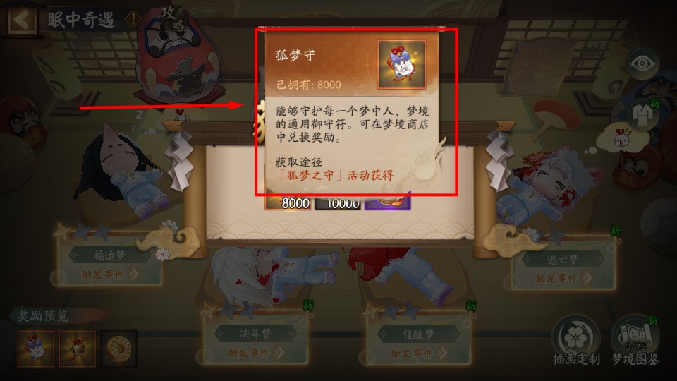 2、【狐梦守】是梦境通用御守,可在梦境商店兑换奖励,通过活动获取,积累数量能提升事件进度。
