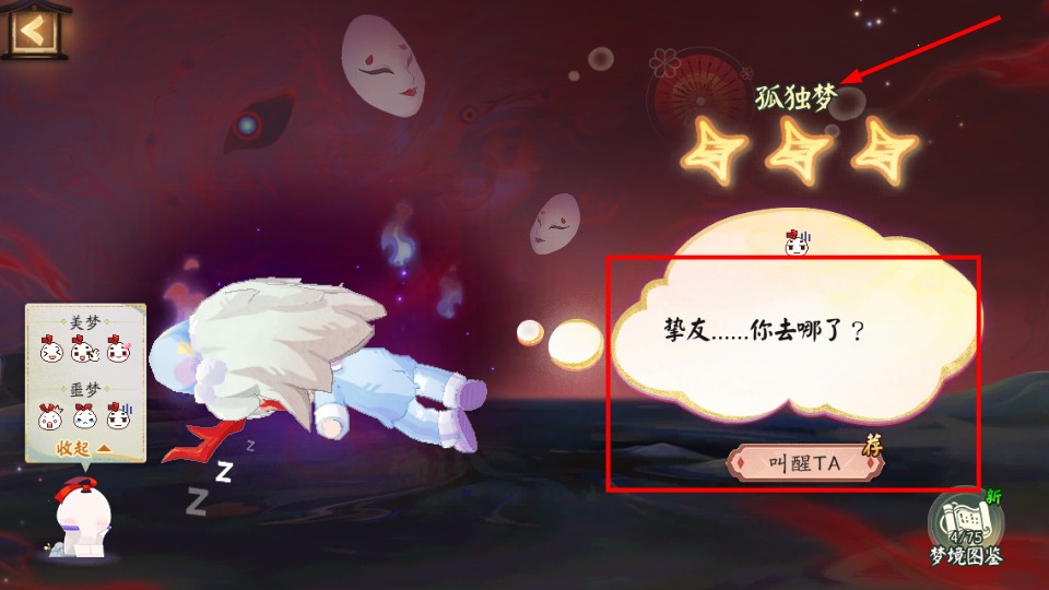 3、孤独梦场景中角色寻挚友的对话出现时,及时互动可触发挚友梦相关事件,解锁对应梦境内容。