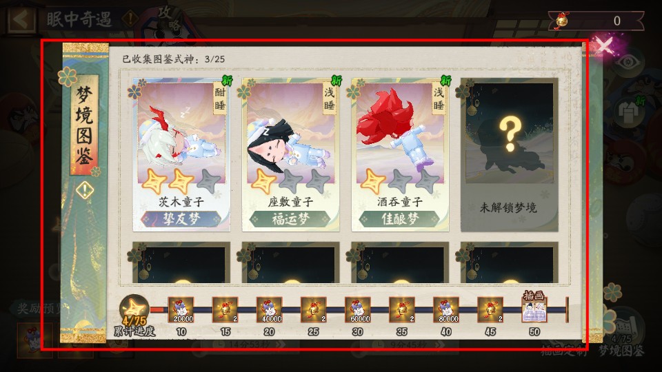 4、梦境图鉴记录式神梦境进度,收集不同梦境式神解锁图鉴奖励,累计进度达目标可领丰厚奖励。