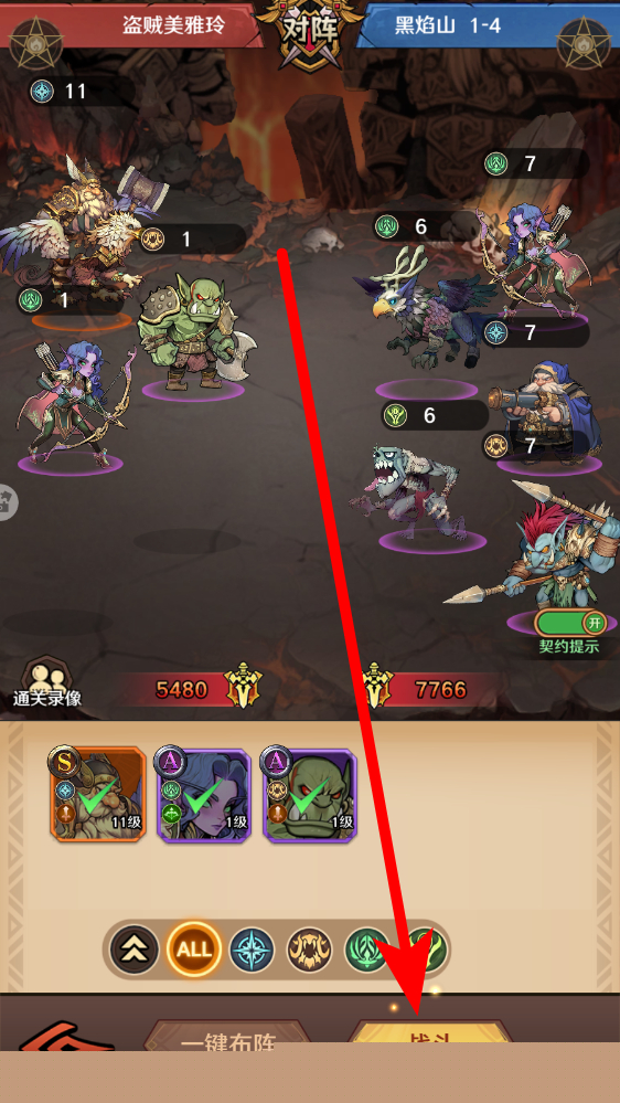 1、战前布阵进入黑焰山对阵界面,查看敌我双方阵容,点击一键布阵或手动调整己方英雄站位,依据英雄特性与敌方弱点优化阵容,提升战斗胜率。