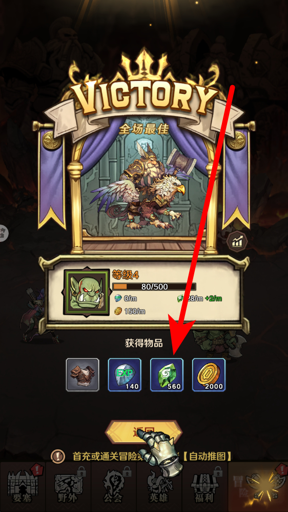 3、战后结算战斗胜利后,进入结算界面,点击领取获得物品,包含装备、经验、货币等资源,这些可用于英雄养成,助力后续关卡挑战。