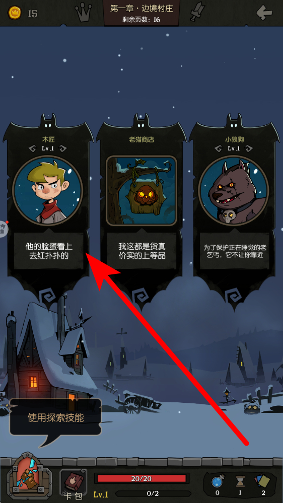 2、进入第一章边境村庄,面对木匠、老猫商店、小狼狗事件,优先交互木匠,触发战斗或交易,根据剩余页数规划探索顺序,合理分配行动,避免资源浪费。